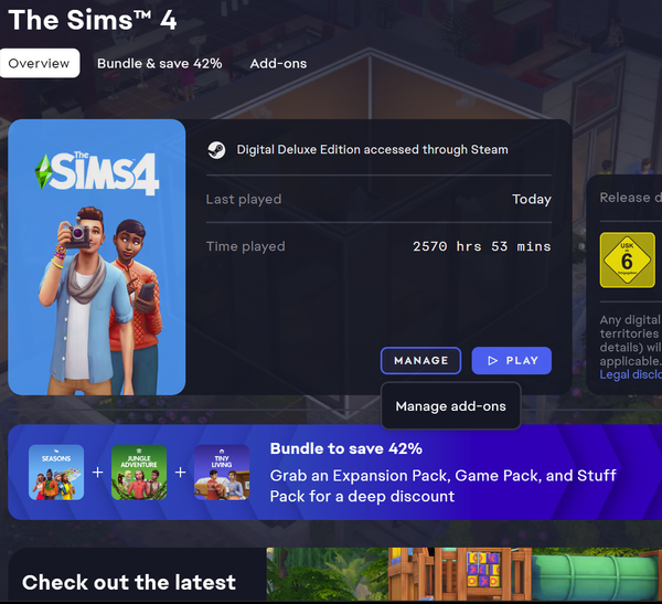 Hallo, ich wollte mein Sims 4 Spiel in der EA App reparieren, allerdings, wenn ich auf verwalten gehe, kommt nur als Auswahlmöglichkeit "Verwalten von add-ons" während bei Bekannten von mir mehr Optionen angezeigt werden. Die App ist auf dem neusten Stand, habe es vorhin erst überprüft. Was kann ich da machen?
