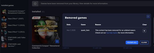 We are seeing RECOVERY of the temporary problem which started on May 22nd at 8 am UTC, which was unintentionally impacting some users, causing them to see the message *"Games have been removed from your library" or *"You don't have access" error on the EA app more frequently than expected.