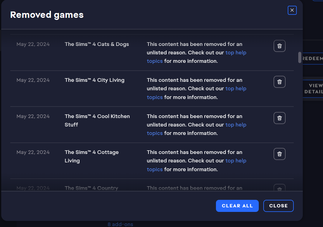 We want to assure you that this feature is often* functioning as intended. Its recent implementation aims to reduce the number of inquiries about missing games or DLCs and provide clarity on why such items have been removed from your library. By clicking on the "VIEW DETAILS" button on the right side of the message, you can see a list of all the games that have been removed and the respective reasons for their removal.