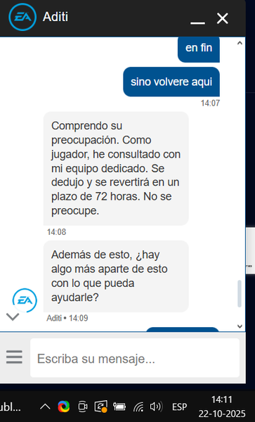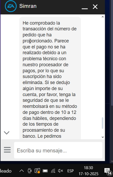 Compre el battlefield 6 el día 11 de octubre, al momento de comprar me apareció fallo al comprar y me descontó el dinero del banco, reclame el mismo día y me dijeron que tendria un reembolso dentro de 24 y 48 horas, al pasar los dias no paso nada, hice un ticket de reclamo el 15 de octubre y me dijeron que era problema del banco y bla bla, cuento corto llame al banco y me mandaron un correo con la verificación de la compra y el abono del dinero a electronic art, por tanto ese mismo dia 17 de octubre realice un ticket en el cual mande una captura de pantalla sobre la respuesta del pago, el cual me dijeron que fue error de su proceso de pago y que tendria un reembolso en un tiempo de 10 a 12 dias, hoy 22 octubre mande otro ticker sobre respuesta y nuevamente culparon al banco, mandando nuevamente la captura sobre el pago realizado. Entonces donde esta el dinero o el juego en mi biblioteca de EA app? Es esto una estafa o que, espero que me puedan ayudar de alguna forma, el juego no es nada barato. gracias y saludos.