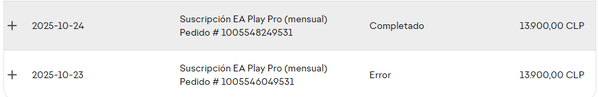 Tengo EA Pro y me hicieron doble cobro en la app sale que el primero fue error pero en el segundo fue completado.en mi tarjeta me hizo el cobro de los dos y no hay devolucion.mande mensaje y no tengo respuesta.