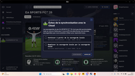 GiorgioExpressoRising Newcomer9 months agoBloqué sur l'échec de synchronisation avec le cloud Quand j'essaye de séléctionner une des deux options cela ne fonctionne pas et je ne peux pas appuyer sur confirmer. Edit: Moved thread to French language EA App forums. -CM Show More