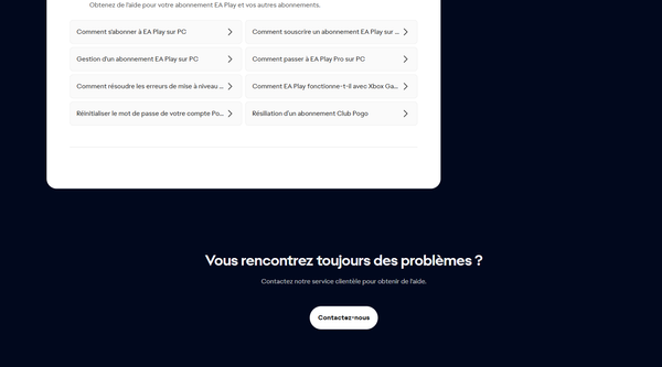 Genre une option > un article > un forum ... Je n'ai pas de : contactez un conseiller ou une conseillère EA Rien du tout. POURQUOI ?