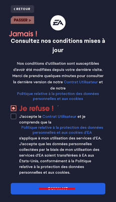 Concernant les conditions d'utilisation, si vous aviez déjà utilisé EA app avant, vous avez forcément du les accepter par le passé. Il faut impérativement les accepter pour utiliser EA app, comme c'est le cas pour la plupart des applications, jeux ou autres abonnements.