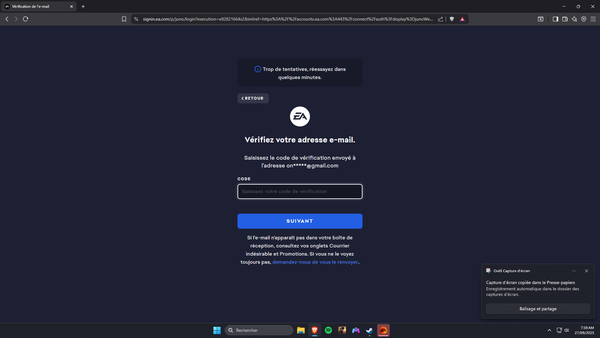 Il arrive que les codes mettent un peu de temps à arriver surtout les week-ends de lancement où il y a du monde. Mais au cas où, vérifiez déjà si le bout d'adresse mail qu'on voir sur votre capture écran correspond bien à votre adresse mail actuelle. Plusieurs joueurs se rendent compte que ça part sur un vieux mail qu'ils n'utilisent plus. Si cela ne suffit pas, vous pouvez contacter le Service Client via ce lien pour voir ce qu'il est possible de faire. Sélectionnez « Mettre à jour le compte EA » dans la liste des motifs pour avoir accès au tchat.