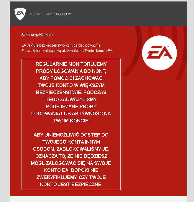To prevent anyone other than you from accessing your account, we have locked the account. This means that you will not be able to log in to your EA account until we can verify your account is secure.
