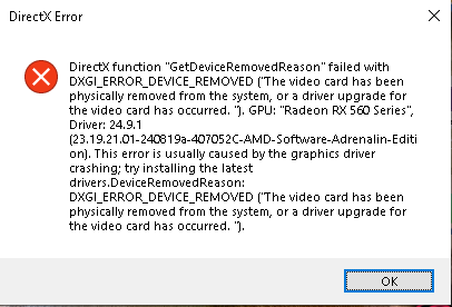 DirectX function "m_devicePlat->CreateCommitedResource(&heapProps, m_defaultHeapFlags, &platDese, creationstate, dearvaluePtr. -uuidoff**Bresourcel, ID_PPY_ARGS_Helper|Bresourcell" failed with DNGLERROR_DEVICE_REMOVED ('The video card has been physically removed from the system, or a driver upgrade for the video card has occurred. "J. GPU: "Radeon RX 560 Series", Driver: 24.9.1 (23.19.21.01-2408198-407052G-AMD-Software-Adrenalin-Editio nil. ExpackagestRenderCore2\2.14.05-fb-fc_21520390,sourcelplatf orm:Dx12:ResourceBuilderDx12.cpp. This error is usually caused by the graphics driver crashing; try installing the latest drivers. DeviceRemovedReason: DAGIERROR_DENCE_REMOWED ['The video card has been physically remowed from the sustem, or a driver upgrade for the video card has occurred. '].