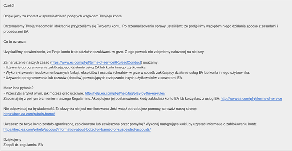 Sprawa jest o tyle dziwna że nie otrzymałem nawet emeila z informacją o blokadzie konta, co więcej po sprawdzeniu przygotowanych i pobranych danych konta nie ma tam żadnej zarejestrowanej aktywności związanej z systemem antycheaterskim. Support niestety też nie pomaga na oficjalnej ścieżce (ea help), a moje odwołanie jest od kilku dni przerzucane miedzy bliżej nieokreślonymi działami. Co mnie martwi, to że wiele graczy zgłasza ten sam problem, linki poniżej do forum ea