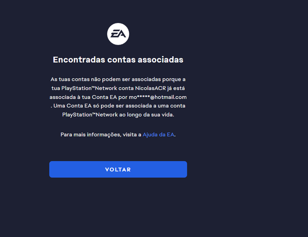 Ola lrqqa4jzvkn9 Essa mensagem de erro informa que sua PSN já esta vinculada a outra conta EA, por isso, não é possível vincular-la novamente. Se você perdeu acesso ao e-mail da conta ou precisa de ajuda, entre em contato contato com nosso Suporte EA onde nossos consultores poderão dar assistência na recuperação da conta.