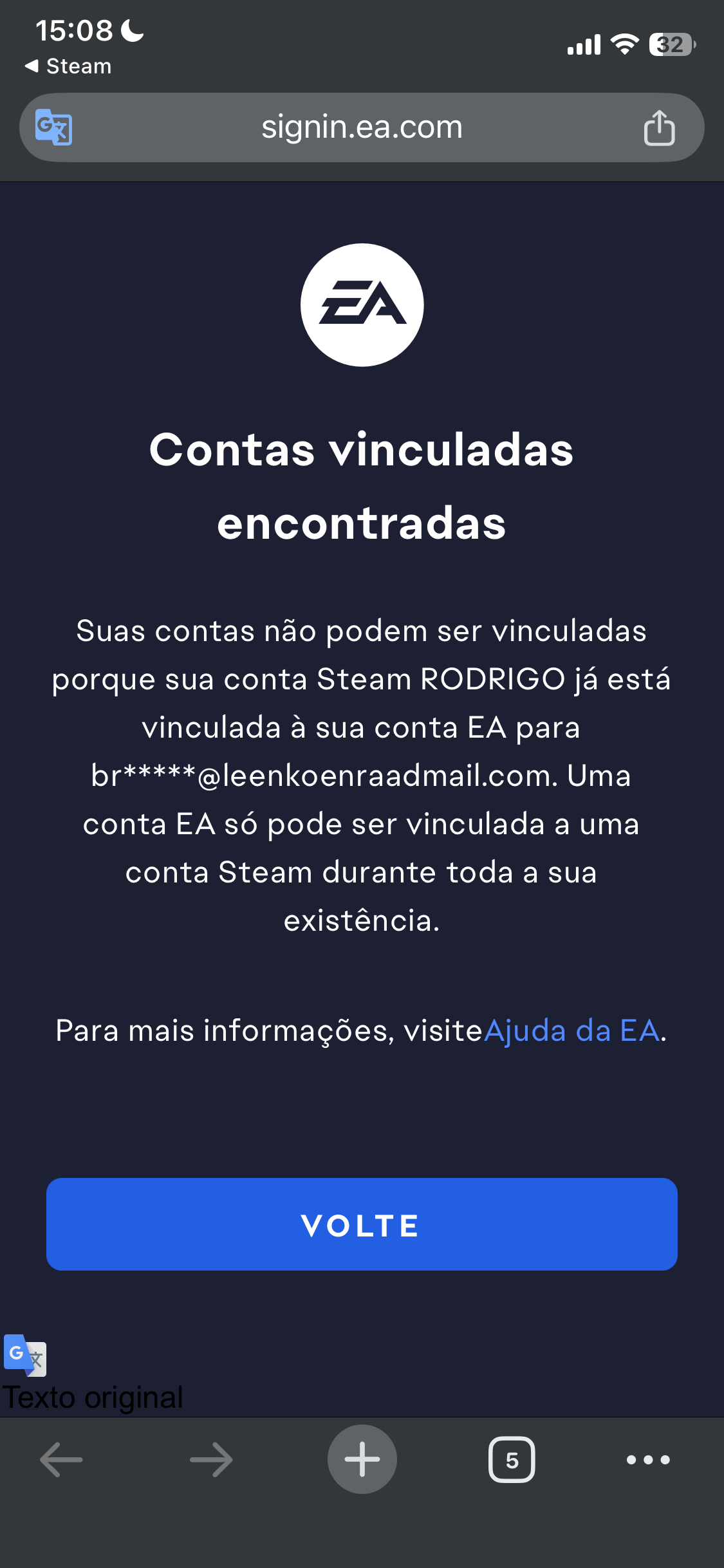 Conta ea vinculado na minha conta steam a minha a qual eu não conheço