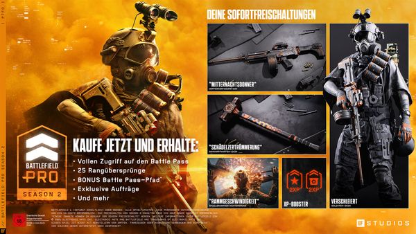 Sei an vorderster Front dabei – mit Battlefield Pro. Erhalte 25 Rangübersprünge zusätzlich zum Basis-Battle Pass, sechs exklusive Sofortfreischaltungen, die Möglichkeit, einen persistenten Server für 100 Spieler:innen in Portal zu hosten, einen dedizierten Bonuspfad in dieser Season und mehr.