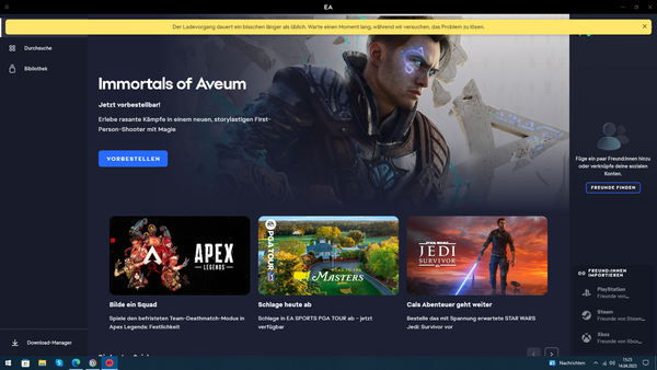 seit heute kommt beim Start von EA Play immer die Fehlermeldung "Der Ladevorgang dauert ein bisschen länger als üblich. Warte einen moment lang, während wir versuchen, das Problem zu lösen." Nur passiert da nix mehr...