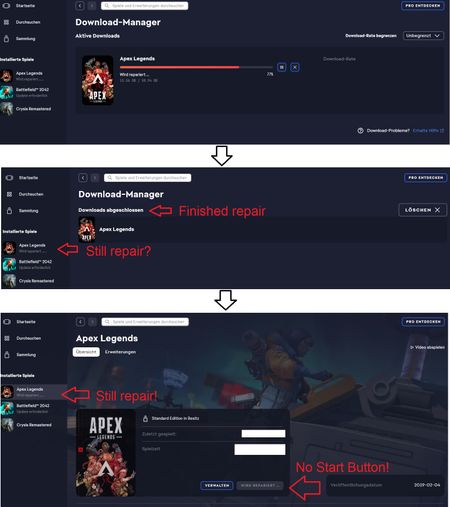 4. PC Neustart und wieder zuerst die Apex Reparatur gestartet, er steckt wieder mit "wird repariert" fest.