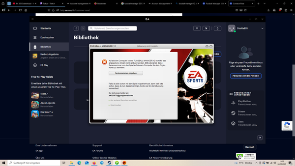 Ich wollte nach langer Zeit wieder den FM2012 spielen. Das letzte Mal habe ich auf meinem alten PC gespielt, damals noch mit dem Origin-Zugang. Das Spiel liegt im Original mit Key vor. Nach dem Installieren sollte ich mich bei EA anmelden (EA App), das habe ich auch getan. Leider kann ich das Spiel nicht der Bibliothek hinzufügen, da kommt eine Fehlermeldung. Ich vermute da es noch im alten Origin angemeldet wurde.