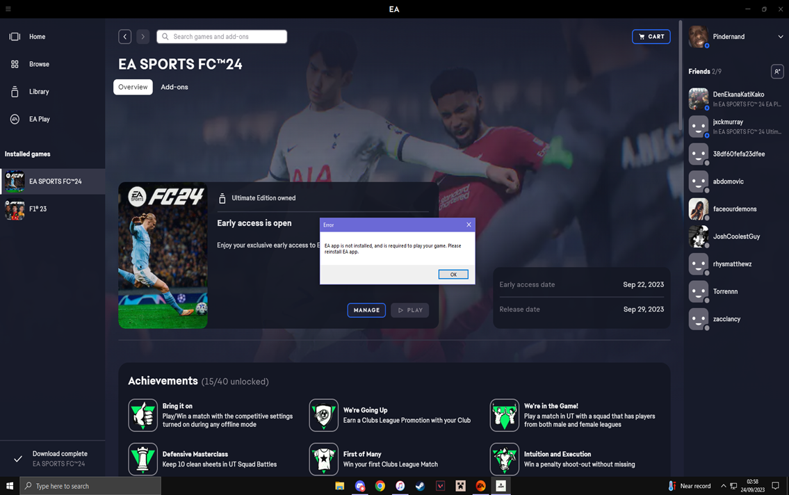 Since the bug has occurred, I haven't been able to play either F1 23 or EAFC 24. With me owning the ultimate edition of EAFC 24, me not being able to use a feature i have paid EXTRA for doesnt seem good enough.
