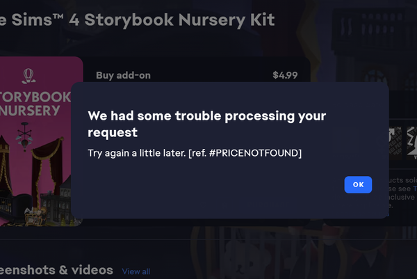 mariasgorlovSeasoned Newcomer5 hours agoCan't purchase the storybook nursery kitpopping up "price not found"?? I'm playing on windows pc, the EA app updated Screenshot 2026-02-14 113335.jpg68 KB