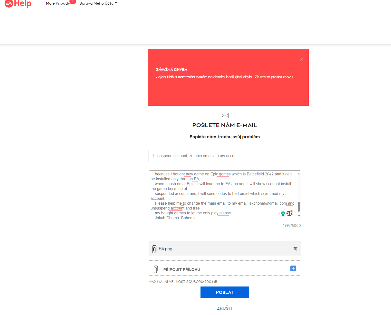 Summarize your bug Hello, could You help me bring back the Game of BF 2042, It is not about the game as about the hacked account on EA. I have there some games on account Squoremorn, after some time I decided to buy cheap Battlefield 2042 at discount and try to install it through Epic, but it sent me to EA app and it showed my accountn is blocked and I cannot play bought game. Always it will show verification but it will give me request to writte a code which was sent to anotheremail@rambler.ru, so maybe it was eastern virus or hacker who broke my account. Could You please help me to revive and return and unsuspend my account Squoremorn and give there back my primary email as users email, at Answer portal I was able to change it back to jakchoma@gmail.com but at the app, it will show me I cannot change the email, so my acc Squoremorn jakchoma@gmail.com was eaten by russian zombie hacker malware probably. Please change this acc back to jakchoma@gmail.com to let me play my Battlefield 2042 only. Best regards in case of help, It will be my honour. Jakub Choma