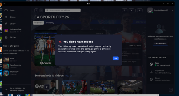 PoundedSaucer10Newcomer3 months agoea app doesnt see game fc 26ive bought and downloaded fc 26, ea sports app says I dont have access to it. The installation complete notification is literally still the last in my queueany ideas?
