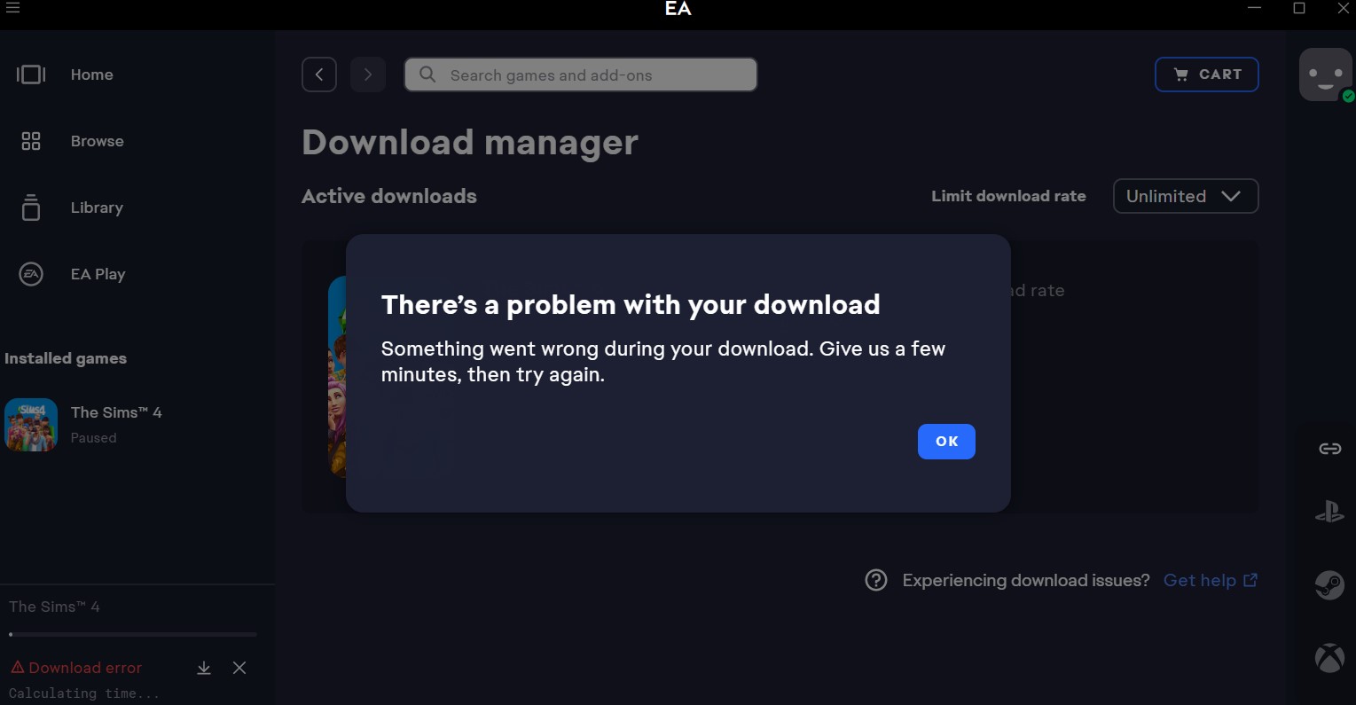 czyszczenie pamięci podręcznej, reinstalacja aplikacji, uruchomienie jako administrator, odpalanie aplikacji od nowa. Patrzyłem tez na drugi komputer- jest ten sam błąd. Przeglądałem posty na EA Answers.. NIC NIE SKUTKUJE. Nie chce pobierać żadnych DLC do Sims 4. To jest jakaś farsa lekko mówiąc...