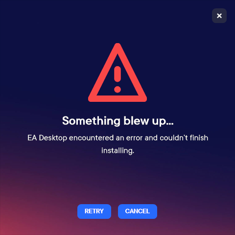 What happens when the bug occurs? Installation halts with an error message "Something blew up... EA Desktop encountered an error and couldn't finish installing." Clicking the "Retry" button results in the same error.