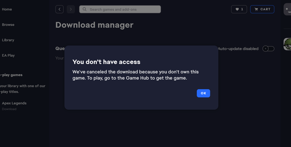 tried clearing cache, reinstalling ea app, login in another computer. same issue