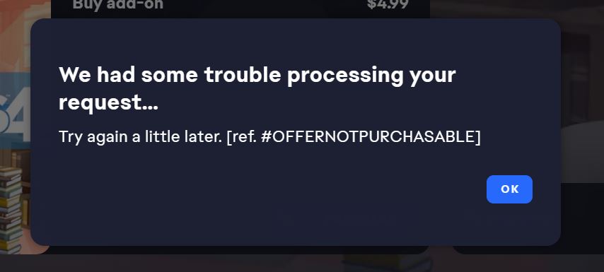 "We had some trouble processing your request... try again a little later. [ref. #OFFERNOTPURCHASABLE]"