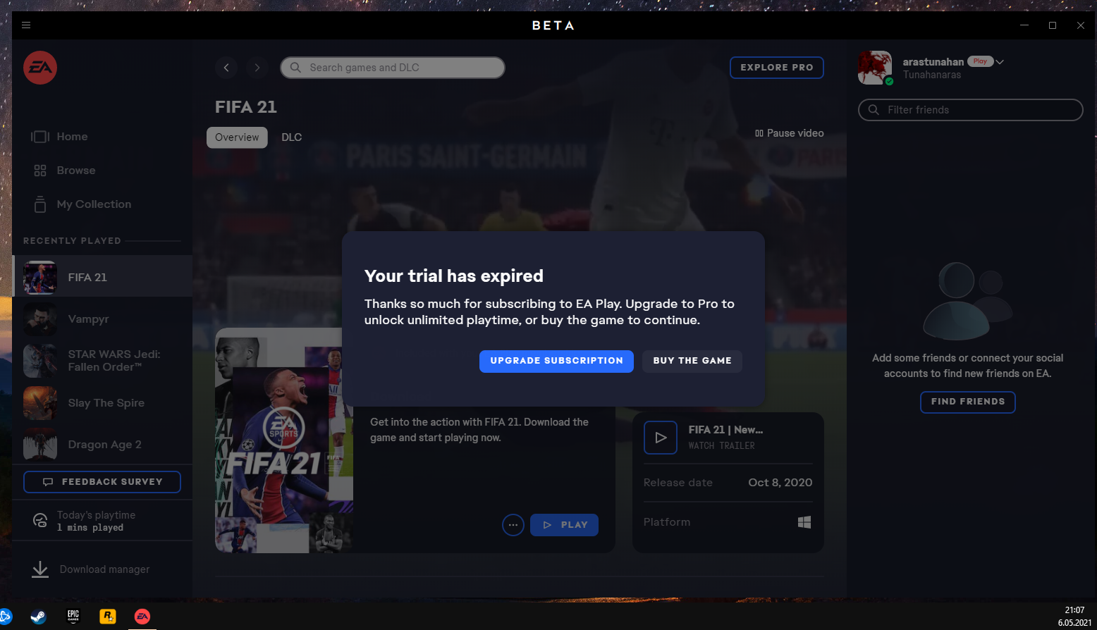 What do you expect to see? Hello, I can't play Fifa 21. I have xbox game pass with ea play. When I click "play" EA Desktop App tells me "Thanks so much for subscribing to EA Play. Upgrade to Pro to unlock unlimited playtime, or buy the game to continue." I reinstall EA Desktop App and problem not gone. Plz help me.