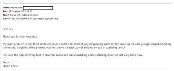 Once you have confirmed that your EA app is up to date, please try reproducing the issue again and let us know if you are still experiencing it or if the issue has been resolved.