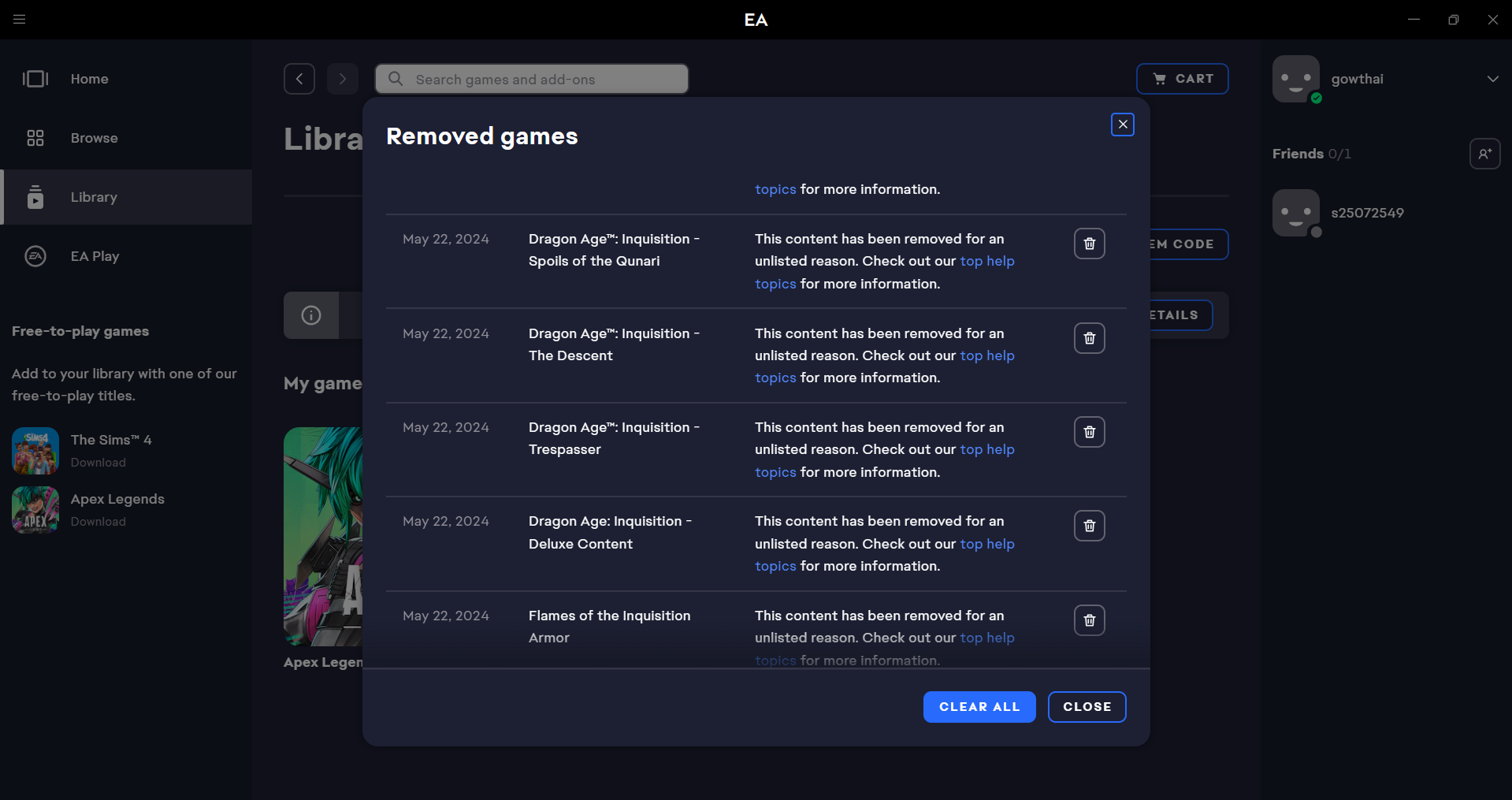 • For the message "Games have been removed from your library" in the EA app, click here.