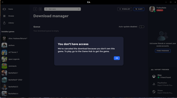 We've noticed some of you are still running into the "You don't have access" error in the EA app while downloading or installing games or DLCs, or when trying to launch one of your games via the EA app (exact errors shown below).