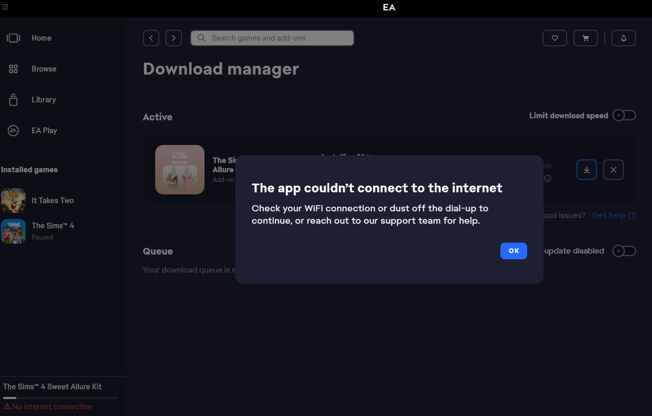 I purchased 10 kits, and one of them gives an error when downloading, is no more than 23% and gives the error: "no Internet connection". I have already restarted the computer, cleaning the app cache, started the app as administrator, I have already repaired the game, I have already uninstalled and installed the game, I have already uninstalled and installed the app, I have insisted on downloading, but it does not go forward; it pauses and does not return. I have checked and I am not experiencing problems with the internet, so much so that I managed to install all the others, except for this one. The only thing left to do is return the DLC and make the purchase again, but it doesn't show in the EA refund