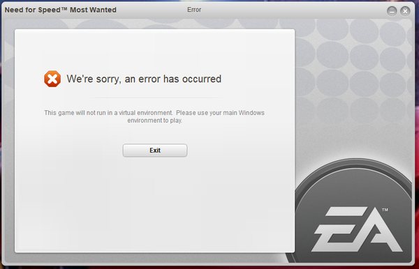 I recently purchased NFS-Most Wanted from EA Platform but when I try to run the application and play the game I run into the error of virtual environment error. Please help see the attached picture of the error for reference.