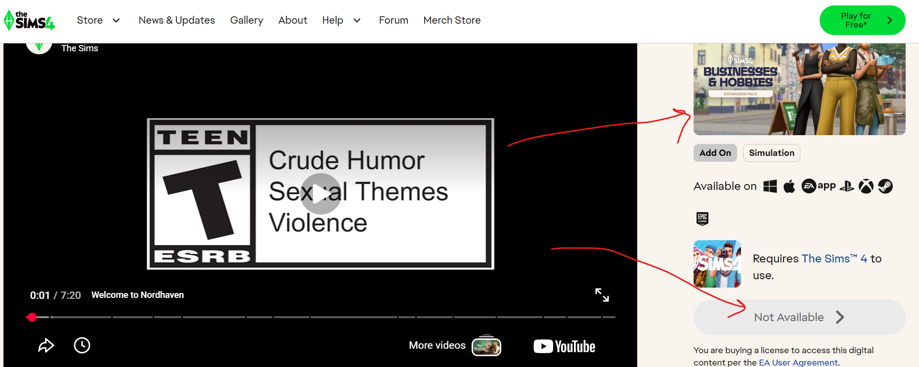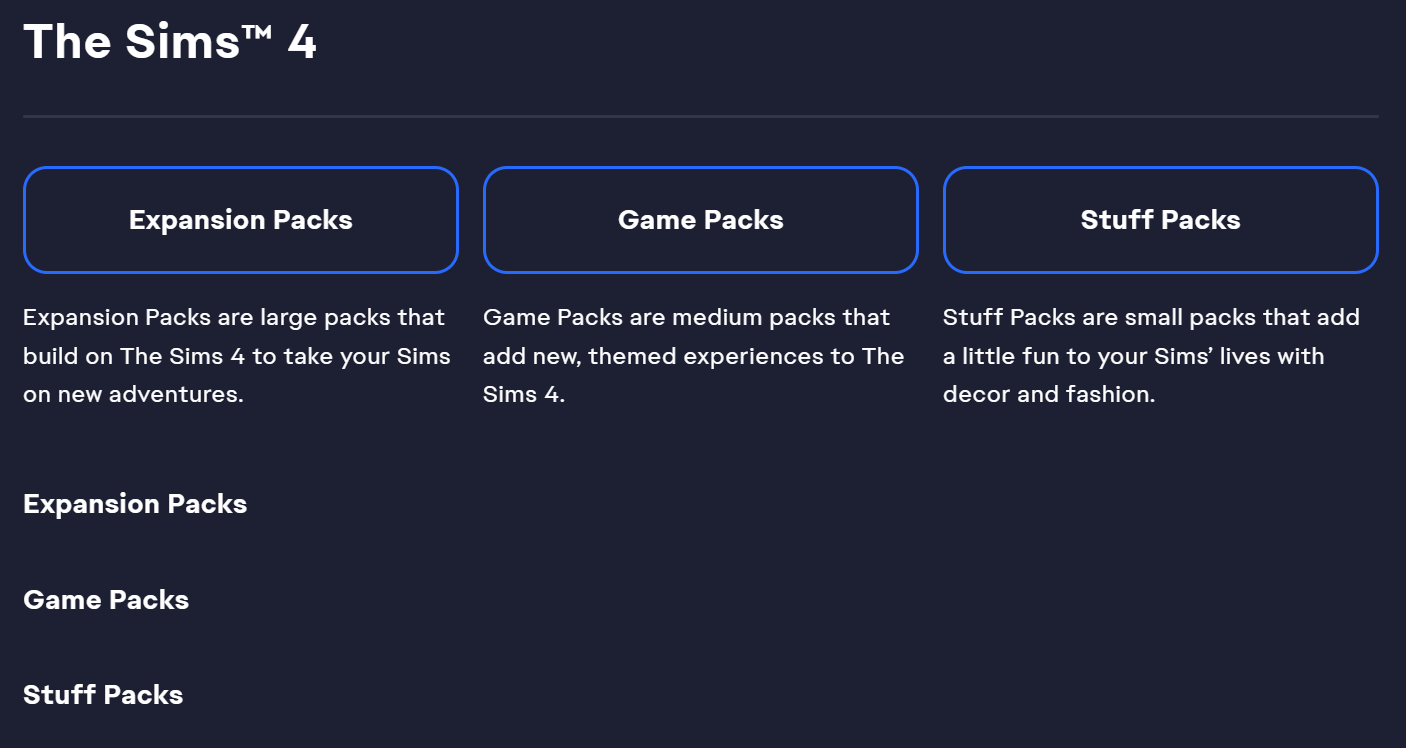 I have been having this exact issue since December 2024. i wanted to buy add ons through the EA app but i didn't find any of them. I looked them up through the sims 4 official website i found the packs however it shows (not available ) when i intended to purchase. i have contacted their support system multiple times but no reply so far. its devastating