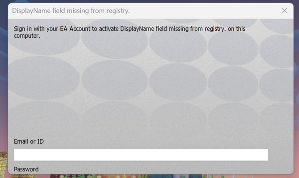 This ^^ is the window that pops up when I try to launch the Sims 4. When I hit the play button in the EA app, a weird little window opens with this across the top, a funky patterned background that says "DisplayName" is missing from the registry on my computer and I need to sign into my EA account to fix it, and a box for me to input my username. In theory there's a box for my password too, but it is shoved all the way out of the bottom of the window and I can't resize the window or scroll to get to it, so... in theory I could sign into my EA account through this weird window, but I'm kinda not sure if I should??? I've never seen this before. I played the Sims 4 just fine two days ago so I don't know what happened.