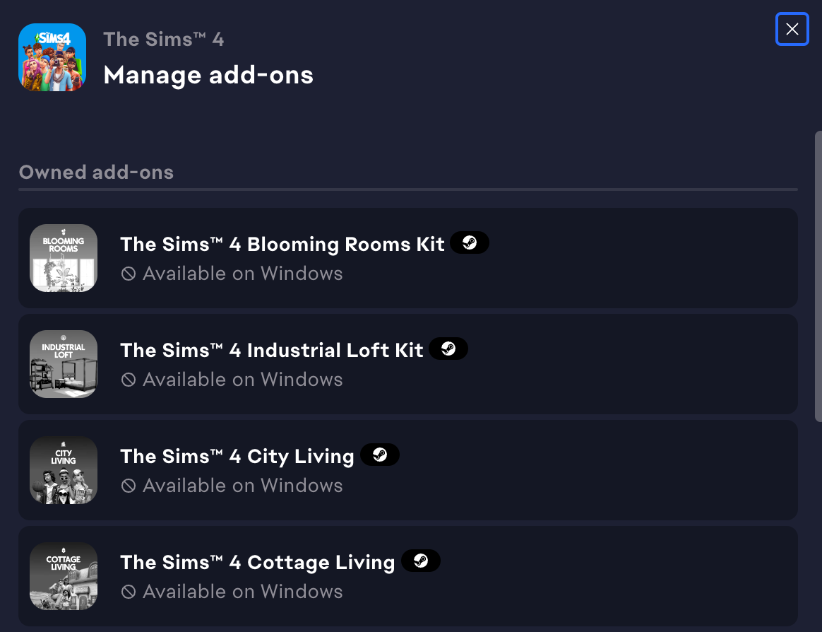 SIMS 4 - Switched from PC to iMAC. Can't acces DLC "Available for windows"