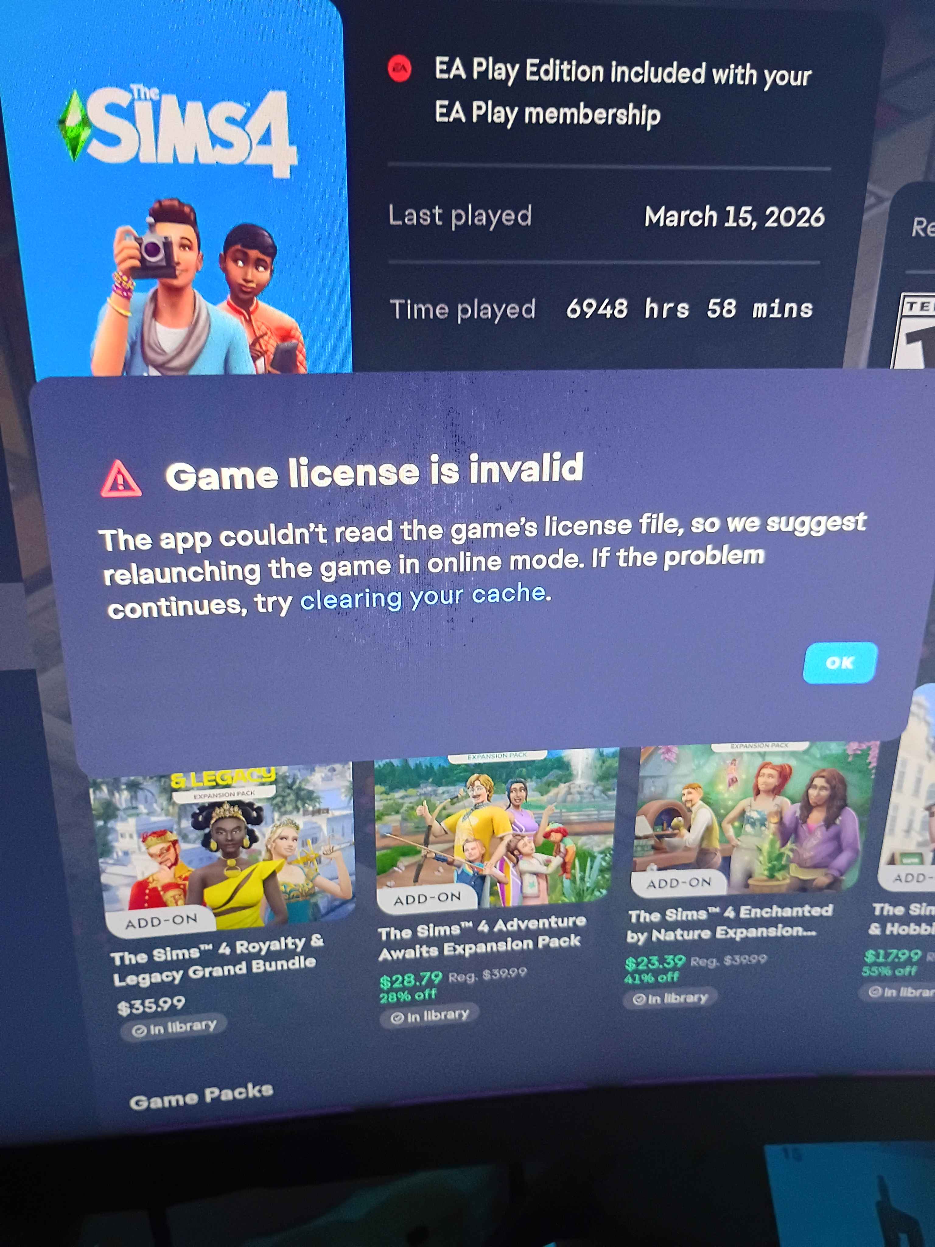 the app couldn't read the games license file, so we suggest relaunching the game in online mode. if the problem continues, try clearing your cache. thats what it says, and no matter how many times i do it, it still gives me that message. it even happens on my other PC and i just dont know what to do anymore, im about to flip my lid and have a huge BF. i have tried everything i can think of, ive uninstalled it, installed it, repaired it, saved my save files and moved them, went to documents and deleted everything, repaired it, found an old copy of sims 4 on my backup drive and repaired it and it also keeps updating none stop, i havent tried getting a pirated version of the sims 4 but im sure it would do the same thing. im out of ideas here. and before anyone ask, no there are no mods on the sims 4, my woman mostly plays the game and she dont use mods. can anyone help me? apparently the post deleted itself so now its up again!
