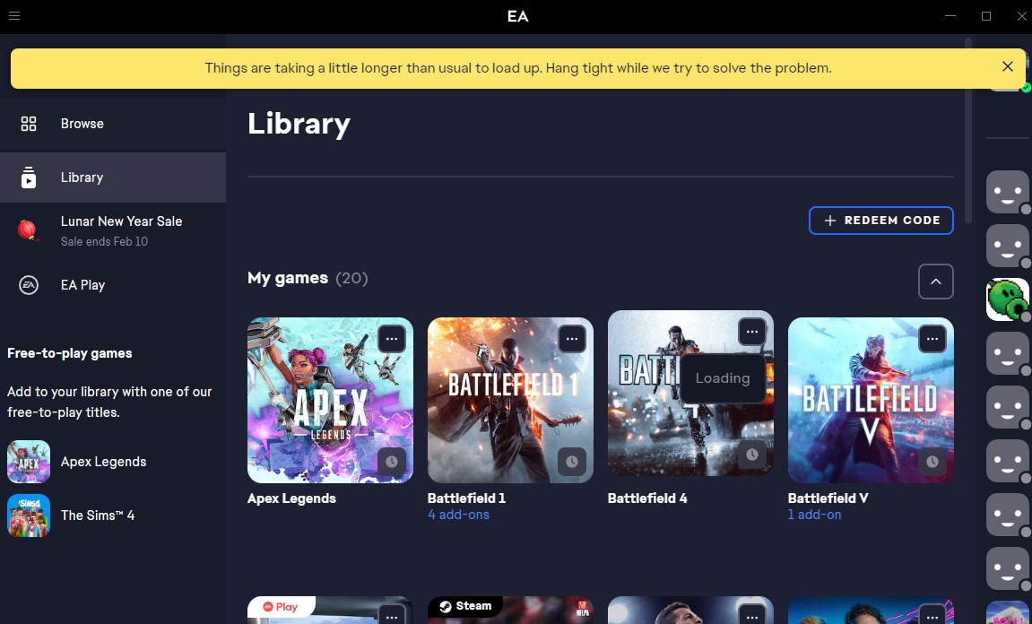 I have been dealing with this for about three months now and it all has to do with the EA app. Whenever I launch the app, it is as if none of my games are installed/available to play(or download), they all populate their respective covers but I cannot do anything to any game(Play, install, uninstall). I get the message up top in a yellow banner that reads: "Things are taking a little longer than usual to load up. Hang tight while we try to solve the problem." All owned games are stuck on "loading" and when you click the tile it only shows 3 loading dots (not the play or manage buttons) and stays there forever. I have essentially lost all access to every game I have purchased.