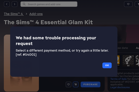 I have been trying to purchase The Sims 4 Essential Glam Kit through the EA App for the past two days, but I keep receiving the following error: