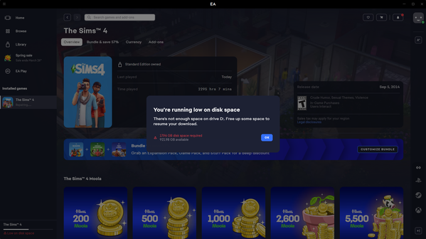 Unfortunately, I already tried that too. Nothing changes when I clear the cache and when I repair the game it says it doesn't have enough storage to repair.