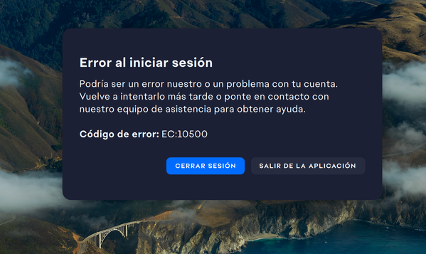 Necesito asistencia técnica con un problema que estoy experimentando desde las 14:50 horas aproximadamente. Al abrir la EA App e introducir correctamente correo y contraseña, la aplicación se queda bloqueada y aparece el EC:10500.