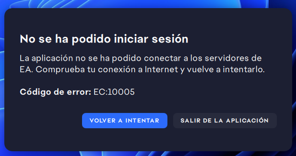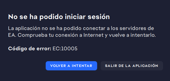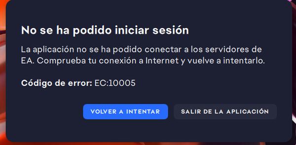 Intento jugar ea fc 26 y no puedo ya que me sale un cartel que dice que no se ha podido iniciar sesión porque la aplicacion no se conecta con los servidores de EA y me tira error EC:10005 y comprobe el estado de mi internet y anda todo correcto