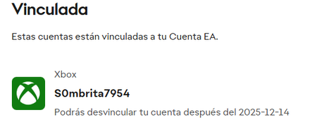 Hola, estoy tratando de vincular mi cuenta de xbox con la de EA, ambas cuentas son nuevas. Revisé en myaccount.ea.com en la parte de connected accounts, y está bien conectada, adjunto la imagen: ...