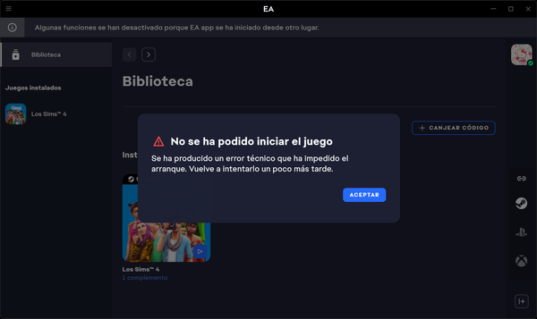 Hola, hace más o menos una semana que no he podido entrar al juego los Sims 4, antes lo tenía descargado desde Steam, pero cuando intentaba abrir el juego me mandaba a la EA app y me tiraba esta notificación.