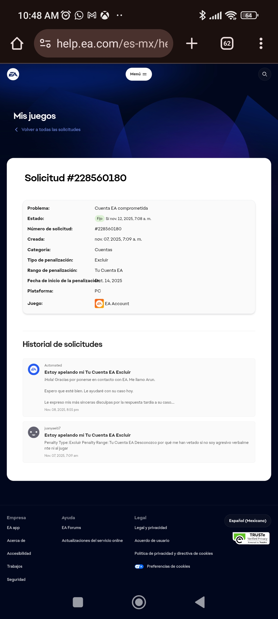 Se me baneo la cuenta, está no, otra, no me deja escribir por qué ya no cuento con la cuenta, hace días que me percate que había sido vetado de EA por supuesto aprobación de la cuenta, el detalle es que cambiaron mi correo al que llegan los mensajes, inicie una apelación para que me devolvieran la cuenta, laabri en la mañana y tuve respuesta un día después a las 9 de la noche un viernes, (imagino que no trabaj. Los fines de semana) sin embargo solo me mandaron un mensaje con un código pero nunca me mencionaron dónde es que debía proporcionar ese código y en dónde estaba haciendo la apelación no tenía forma de comunicarme con la persona, aún tengo mi correo electrónico asociado a la cuenta de juan_yael_67 tengo años con mi cuenta y no quiero perder la, después de que no pudiera recibir información de como proseguir cerré la apelación para intentar abrí otra dos e pueda explicar que no me han dado otra forma de comunicarme así que, necesito respuestas