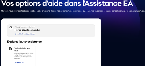 Choisissez une méthode en direct à la place de par courriel. Passez par ce lien et sélectionnez « Mettre à jour le compte EA » dans la première catégorie.