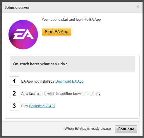 The game won't launch through steam, desktop icon, ea launcher or battlelog. In the broswer on the battlelog site it says this communicate (photo) and continue button kind of restarts the whole process and shows it again with nothing going on. It's just stuck on the browser (doesn't matter which one i'm using) and nothing :/