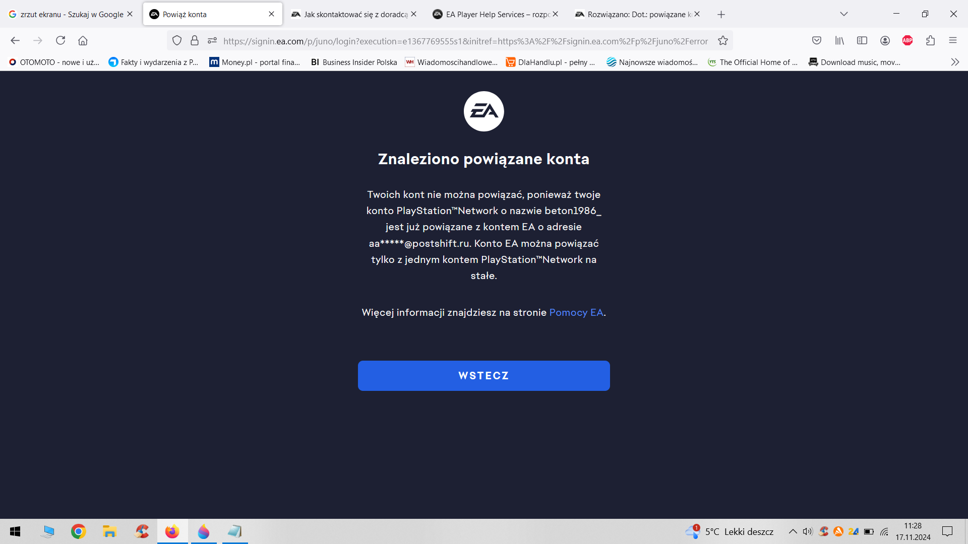 "Twoich kont nie można powiązać, ponieważ twoje konto PlayStation™Network o nazwie kojsik1 jest już powiązane z kontem EA o adresie e0*****@disabled.ea.com. Konto EA można powiązać tylko z jednym kontem PlayStation™Network na stałe." Nigdy z tego co pamietam nie mialem takiego konta.. Prosze pomocy