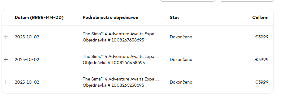 Dnes jsem předobjednávala nový dodatek The Sims 4, při platbě mi to hodilo error, že platba neproběhla, zkusila jsem to ještě 2x a pořád vyskakoval error. Po dvou hodinách jsem koukala v emailu, že mi přišel potvrzovací email o objednávce 3x!!! a pak i v bance 3x odečteno/ blokováno 39.99 ... požádat o vrácení peněz také nejde. Proč bych kupovala stejný dodatek 3x? Stránka pro vrácení peněz se nenačítá nebo se načte, ale volba vrácení peněz nikde není. V účtu EA nevidím ani ostatní hry, které jsem zakoupila za ta léta a to jich tam mám tak 50+! Jak toto řešit? děkuji