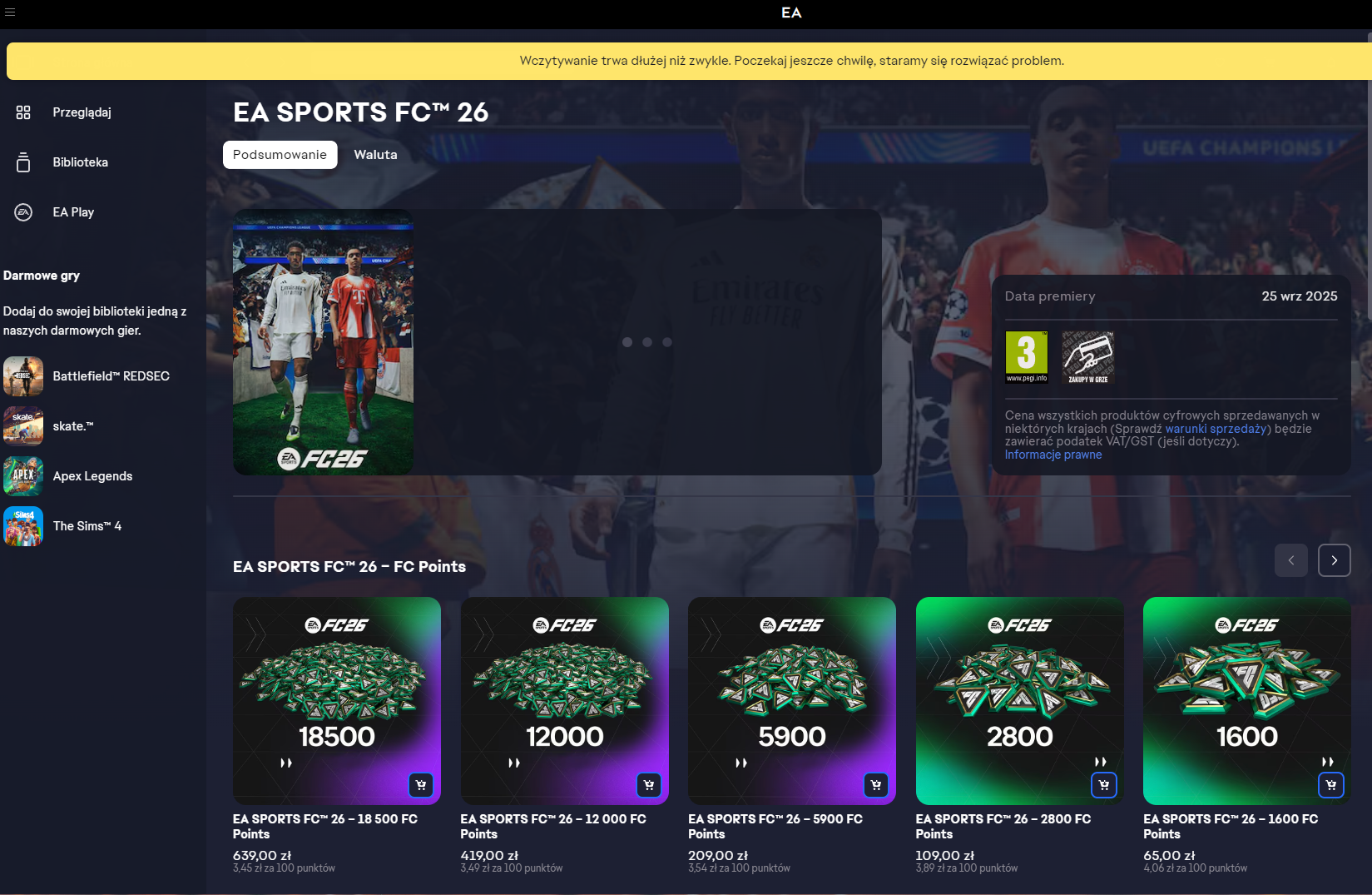 Od kilku godzin po wejsciu do aplikacji ea wyswietla się napis "Wczytywanie trwa dluzej niz zwykle. Poczekaj chwilę, staramy się rozwiązać problem". Wyczyszczenie pamieci podrecznej oraz ponowne zalogowanie nie pomaga. Nie mam dostępu do żadnych gier.W miarę możliwości proszę o szybką pomoc. W załączniku przesyłam screena z ea app.