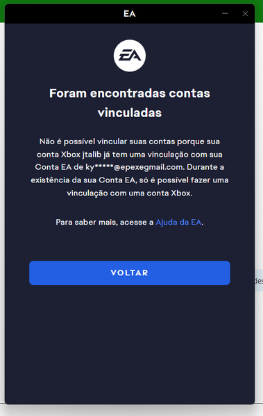 Entre por gentileza em contato com o Suporte da EA vi chat aqui para verificar sua conta e receber auxilio na vinculação.